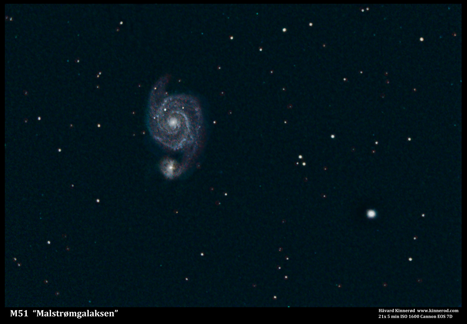 The Whirlpool Galaxy (also known as Messier 51a, M51a, or NGC 5194) is an interacting grand-design spiral galaxy in the constellation Canes Venatici. Recently it was estimated to be 23 ± 4 million light-years from the Milky Way Galaxy, but different methods yield distances between 15 and 35 million ly. Messier 51 is one of the best known galaxies in the sky. The galaxy and its companion (NGC 5195) are easily observed by amateur astronomers, and the two galaxies may even be seen with binoculars. The Whirlpool Galaxy is also a popular target for professional astronomers, who study it to further understand galaxy structure (particularly structure associated with the spiral arms) and galaxy interactions. (Wikipedia)